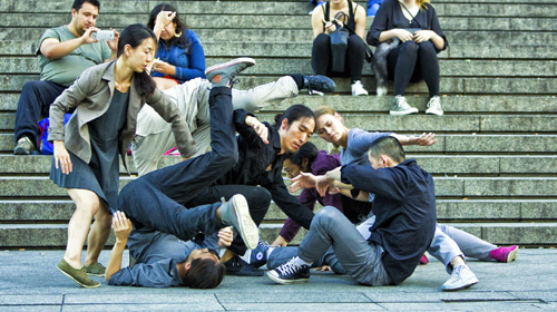 Zeit und Raum lassen sich nicht voneinander trennen. Damit wir die beiden Phänomene als eines wahrnehmen können, legt Ilona Pászthy ihre neue Produktion an drei öffentlichen Orten in Köln an. Auf der Domtreppe entwickelt sich aus dem Getümmel von Passanten und Touristen eine Performance der Tänzer von Pászthys Ensemble und den Mitgliedern des Trust Dance Theatre aus Seoul. Da gibt es neugierige Blicke und die Smartphones werden gezückt, wenn sich die Tänzer bei den Händen nehmen und in einer Art Zeitlupe die Treppe hinabzustürzen scheinen. So beiläufig die Aktion begonnen hat, so diskret löst sie sich auch wieder auf.