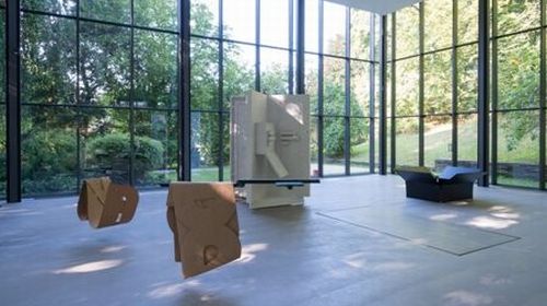 Im Ausstellungspavillon des Skulpturenpark Waldfrieden in Wuppertal sind jetzt zehn seiner Werke aus den Jahren 1999 bis 2013 ausgestellt, welche die wesentlichen Aspekte und Überlegungen in seinem Schaffen ansprechen. Eine Überraschung sind die neueren sog. „Schattenversionen“ von 2012/13, die man im Original, als Raumgefüge sehen muss, um sie begreifen. Auf dem Boden stehen Schachteln aus Stahlblechen, den „Deckel“ aus zwei Schichten in komplementärer Farbigkeit aufgeklappt. In seinem Innenraum sind geschichtete ausgeschnittene Flächen ausgelegt. Erst auf den zweiten Blick wird deutlich, wie verwandt diese „Schattenversionen“ etwa den eineinhalb Jahrzehnte zuvor entstandenen Werken sind, welche an Seilen hängen und mit ihren Metallstreben den Charakter von Marionetten tragen.