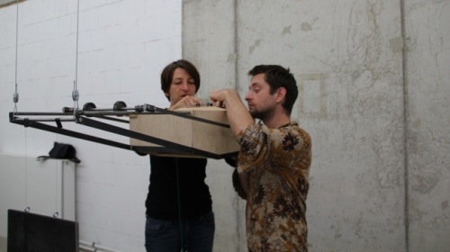 Schon beim Eintreten in den Raum ist man sofort eingenommen von den schwebenden Klangkunstwerken, die an Seilen von der Decke hängen. Während man die feinen Töne vernimmt, die sich teils im Duett vereinigend, teils um die Aufmerksamkeit des Besuchers buhlend in die Gehörgänge schleichen, wandelt man um die hölzernen Objekte und versucht zu ergründen, wie der wundersame Klang entsteht, der den Raum samt Besuchern einhüllt. Fast wie eine skulpturale Klangfigur muten die Töne an. „Im ständigen Wandel changieren sie kaleidoskopisch“, fügt Simon Rummel hinzu, während er selbst ganz fasziniert auf seine Klangmaschiene blickt.