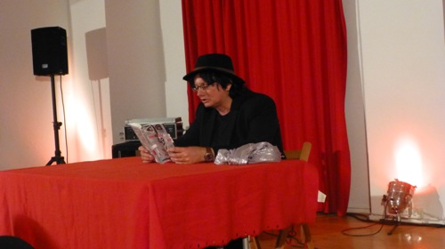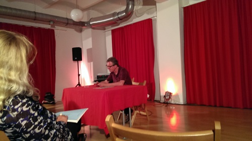 Daraufhin betritt Benjamin Schmälzlein die Bühne, der zum Klang von düsteren Mönchsgesängen aus der Stereo-Anlage mit viel Intensität sein Gedicht „Mein Vater – Unser Leid“ vorträgt. Der Autor beschreibt einen Alptraum vom Weltuntergang, erzählt aus der Perspektive eines Kindes. In der lyrischen Erzählung wird von „farbschwangeren Tapeten“ gesprochen und „Glasmurmeln, die umher rollen“, doch wohin sie rollen, ist wahrscheinlich egal. Im Anschluss liest Jo Stammer aus seinem Kriminalroman „Täuschend Echt“, der in der Kunstfälscher-Szene spielt. Der vorgetragene Ausschnitt spiegelt auf amüsante Art und Weise die Motivation des Protagonisten wider, der so unzufrieden mit der eigenen Identität ist, dass er die Identitäten berühmter Künstler annimmt und beginnt, deren Gemälde zu fälschen.