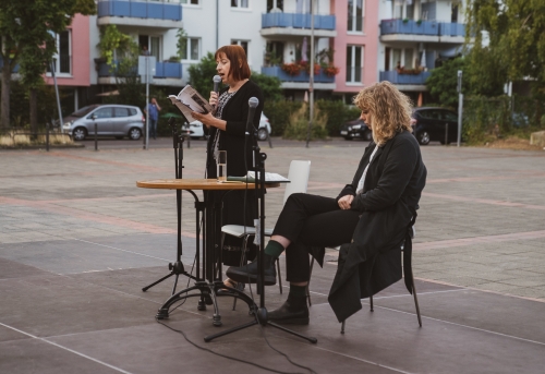 Alle Stühle, Bänke und Sofas sind besetzt, als Kasnitz, Philipp-Bo Franke und Jonas Linnebank von KLiteratur sowie Elizaveta Khan, die Geschäftsführerin des Integrationshauses, den Abend eröffnen. Der Himmel ist klar, der Abend noch mild, der Platz bunt und belebt durch spielende Kinder. Die KLiteratur-Autoren „performen“ einen Text, der auch als Einleitung in dem kleinen, liebevoll gestalteten Festival-Reader zu lesen ist. Er ist eine Hommage an Stimmen und Sprachen, aber sagt auch, dass eine Stimme Resonanz braucht: „Wenn das mit der Resonanz funktioniert, wird Stimme dann auch zu Mitbestimmung.“ Eine Aufforderung zum Zuhören und zum eigenen „resonanzieren“. Das Schlusswort hat Elizaveta Khan: „Wir unterrichten zwar auch Deutsch, aber das Schöne am Inhaus ist, dass wir jeden Tag 20 bis 30 Sprachen hören.“