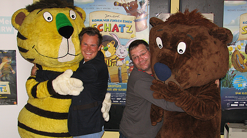 Ebenfalls über den roten Teppich schlenderten mit Malte Arkona und Elton zwei gerade bei Kindern überaus beliebte Prominente, die im Film dem Tiger und Hund Kurt ihre Stimmen leihen. Arkona hatte fünf Jahre lang den „Tigerentenclub“ in der ARD moderiert und ist deswegen geradezu ein Janosch-Experte. Elton, der berühmte Showpraktikant von Stefan Raab, moderiert seit 2010 die Kinderspielshow „1, 2 oder 3“. Sein Vorgänger bei dem beliebten TV-Format, Michael Schanze, synchronisiert in „Komm, wir finden einen Schatz“ übrigens den kleinen Bär, konnte zur Premiere allerdings nicht nach Köln kommen. Nach der Vorführung, bei der die Kleinen im Publikum hörbar mitfieberten und einige Stellen mit herzhaftem Lachen quittierten, begrüßte Malte Arkona in seiner Funktion als Moderator auf der Bühne des Cinenova noch einige Mitwirkende am Film.