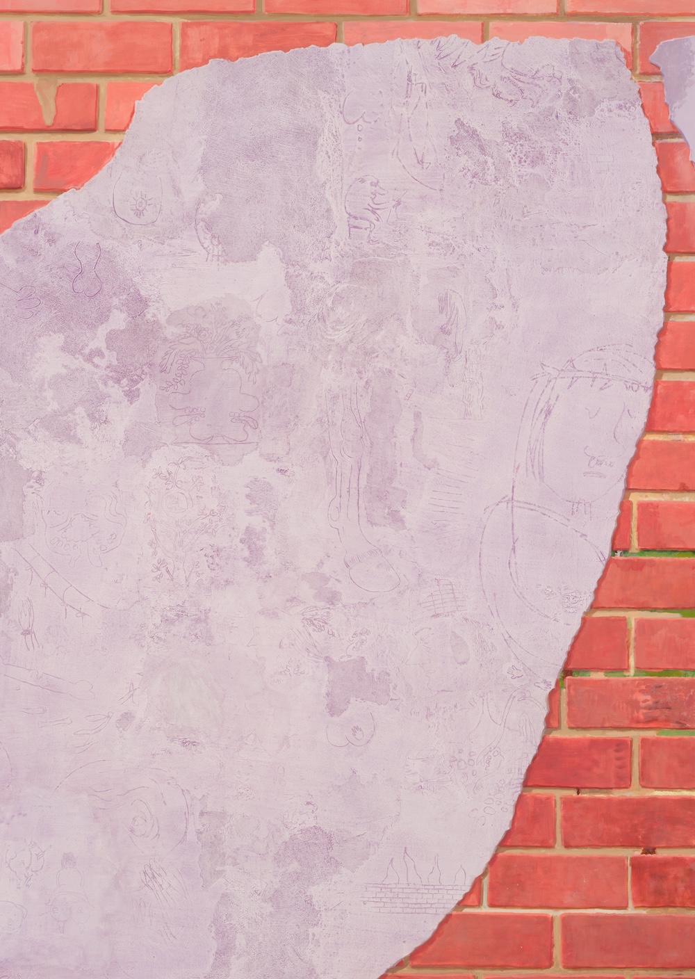 Monika Baer, Schweine Steine Scherben (smoking), 2025, Öl, Acryl. Pigmente und Sand auf Leinwand, 220 x 170 cm, (Ausschnitt). Courtesy Trautwein Herleth, Berlin; Greene Naftali, New York. © Künstlerin, Foto: Júlia StandovárDemgegenüber tragen die anschließenden Mauer-Gemälde eine elementare Profanität vor. Sie gliedern sich in die Gruppen „Lavender wall“ und „Schweine Steine Scherben“ und zeigen gerasterte Backsteinwände, auf die eine amorphe rosa-violette Masse flach aufgesetzt oder eingefräst scheint, umso mehr, als Baer die Malerei mit Quarzsand durchkörnt hat, so dass sie wie Putz anmutet. Andererseits weckt die fleischige Masse mit den wie ausgepressten Farbrändern Assoziationen an einen platt gewalzten Kaugummi und lässt an eine gespannte Haut denken. Sie wird zur Membran, die zwischen innen und außen vermittelt. Die weiche Form ist in der rauen, kantigen und widerborstigen Wand positioniert. Jedoch konterkariert Monika Baer jede hehre Vereinnahmung mit Widerhaken. Hier handelt es sich um winzige Einritzungen, wie Wimmelbilder. Wir sehen Sgraffitos von Banalitäten des Alltags, die als Ausleben von Langweile und Ärger wirken, andererseits sogar antike Reiterstandbilder beinhalten. Beginnt das Profane nicht schon beim Rosa-Ton, der regelrecht provozieren könnte? Zu den Qualitäten des Werkes von Monika Baer gehöre, sagt Valérie Knoll, die Direktorin des Kunstvereins, ihre Aktualität: dass sie die Emotionen der Gegenwart transportiert. Und im langgezogenen, nicht-unterteilten Rechteck des Kunstvereins, das noch seine Wandstruktur betont, wirken die Bilder fast wie eine Fortsetzung der „Entkernung“, als Leinwandflächen und Raum vor dem Raum: offenherzig und geheimnisumwittert im Gegenüber.