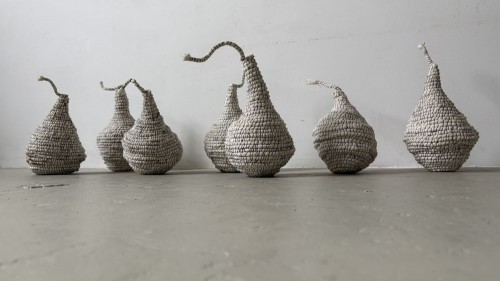 Veronika Moos (*1961 in Bensberg) entwickelt ihre Objekte und plastischen Ensembles bevorzugt mit textilen Stoffen und organischen Materialien, die selbst eine ausgesprochene Zartheit kennzeichnet. So verwendet sie Flachs, Algen oder Steine, die sie auffädelt, die zu schweben scheinen und Schatten werfen – und sich in der Reihung in Nuancen unterscheiden. Sie erzeugt Denkräume, die nur wenig vorgeben und den Betrachter auf diskrete Weise für das Innehalten sensibilisieren und vielleicht auch auf seinen Blick auf die Natur einwirken. Die Ausstellung ist Teil der Reihe „Ortstermin“.